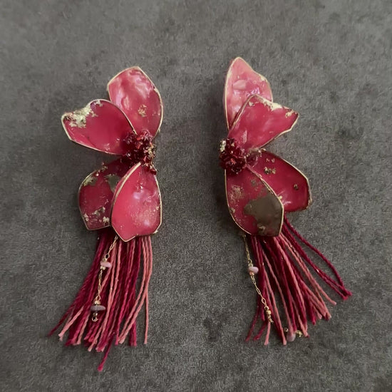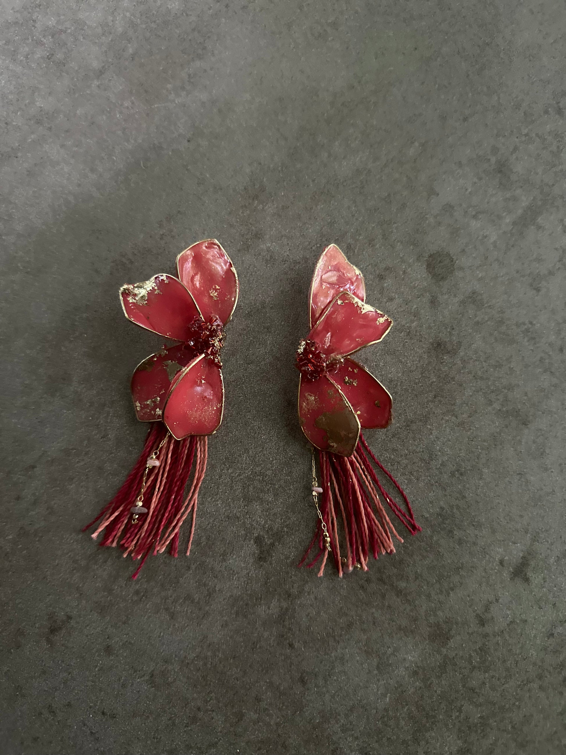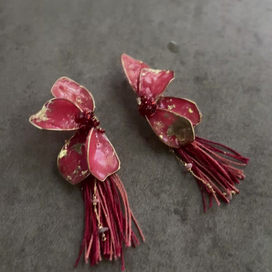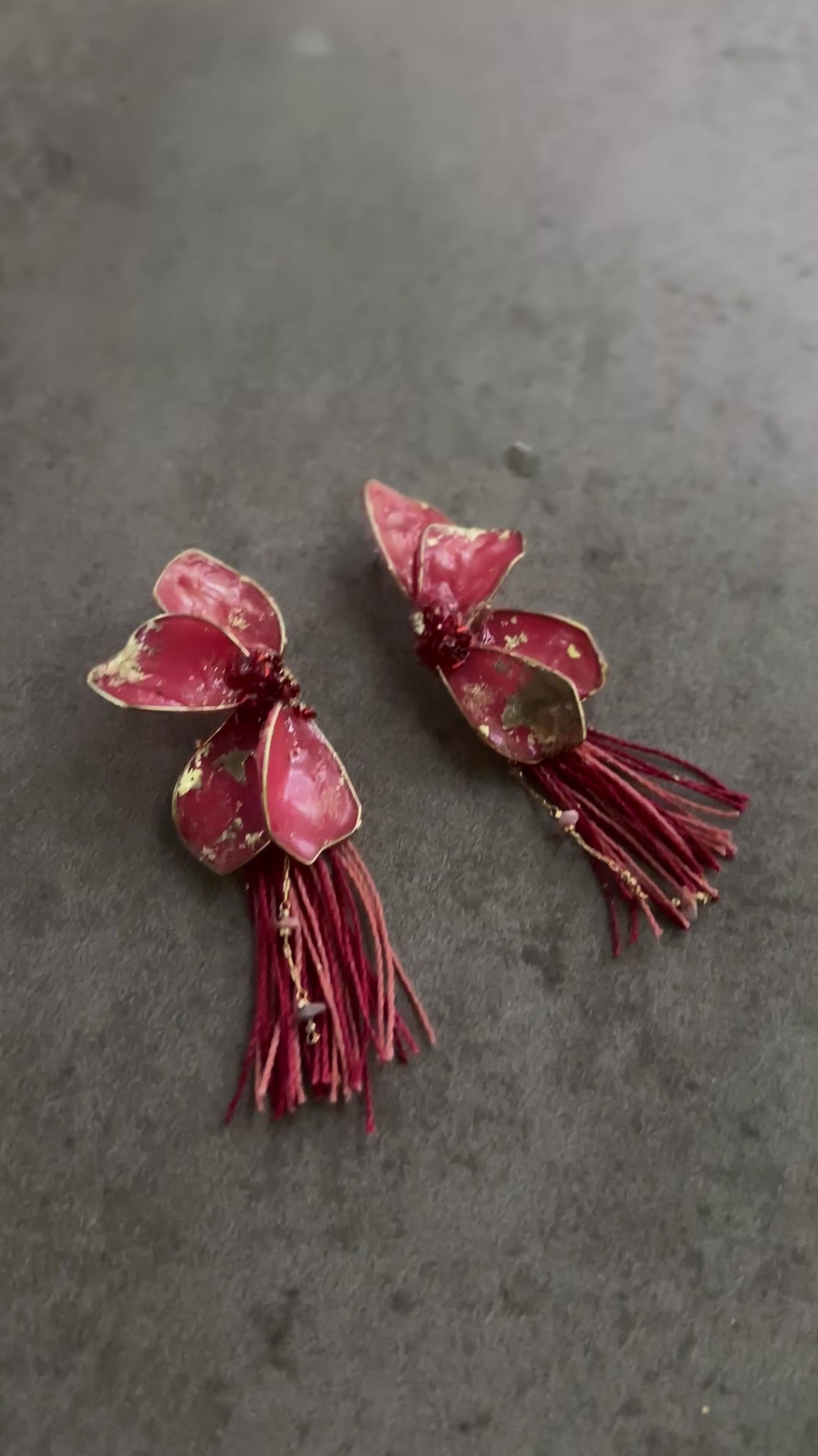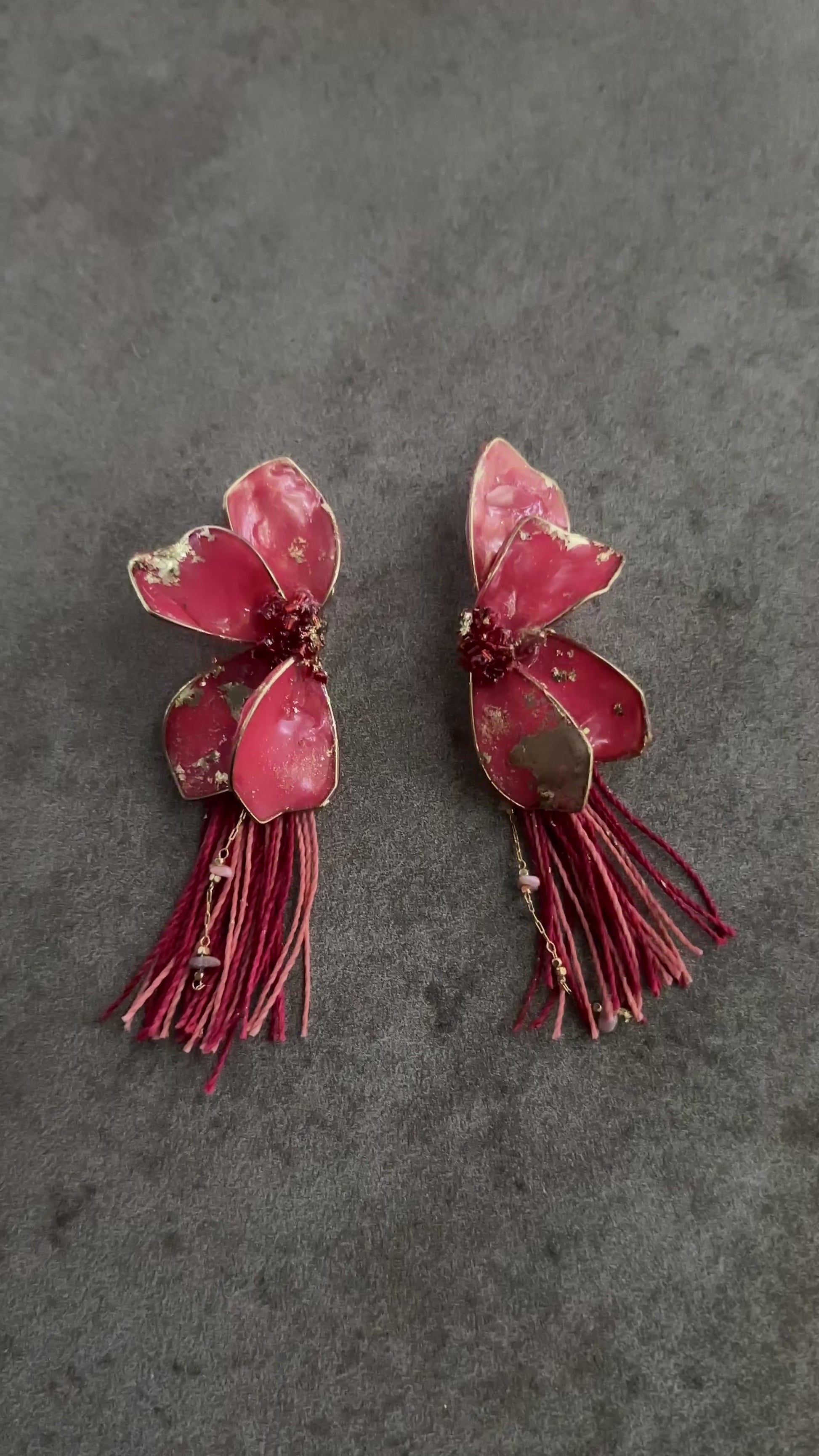 Aros súper livianos en estructura de bronce, en este diseño se destaca en la paleta de colores desde el salmón al rojo con detalles en hilos rosas y piedras engarzadas en cadena de acero con baño en oro .