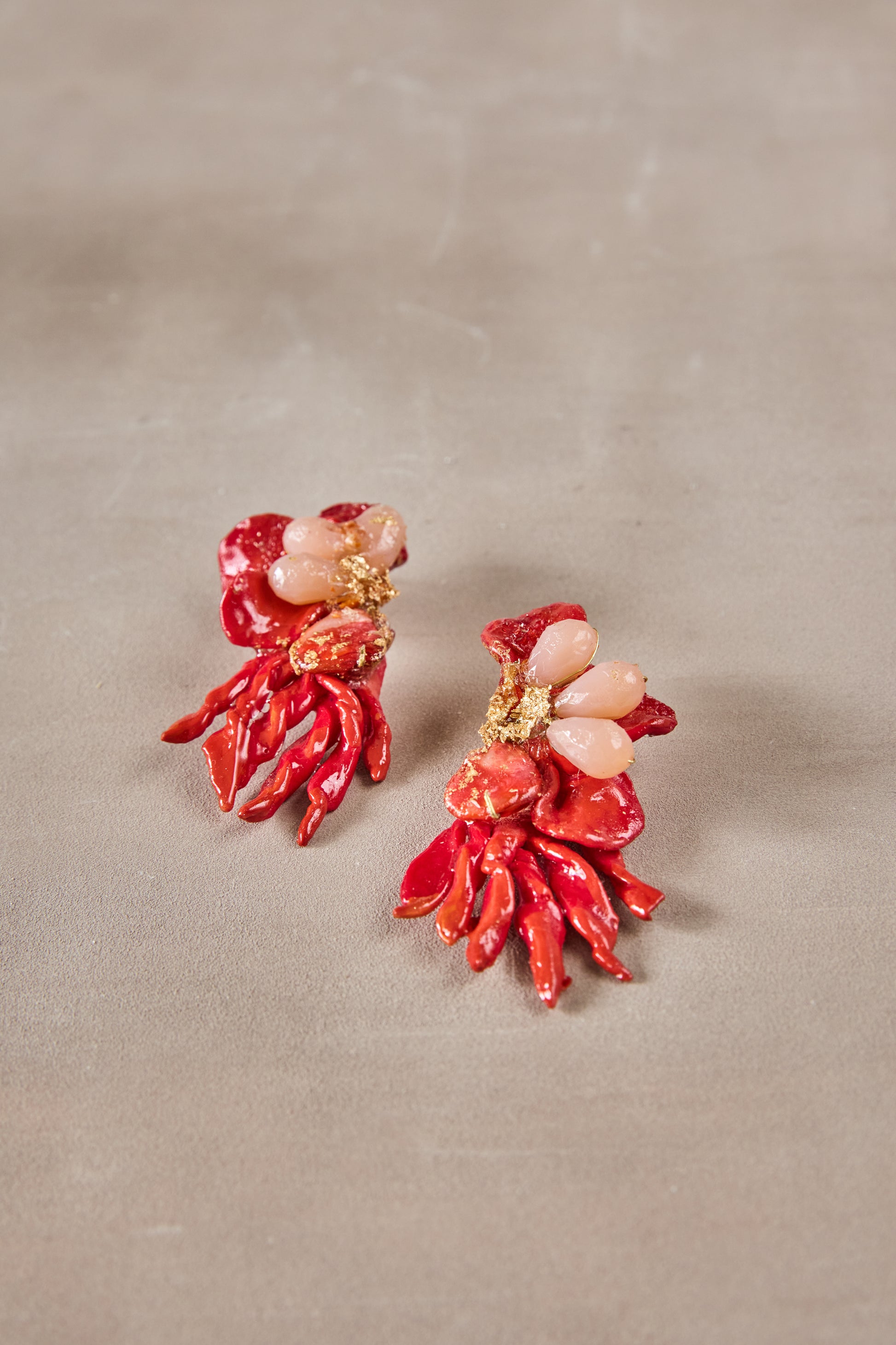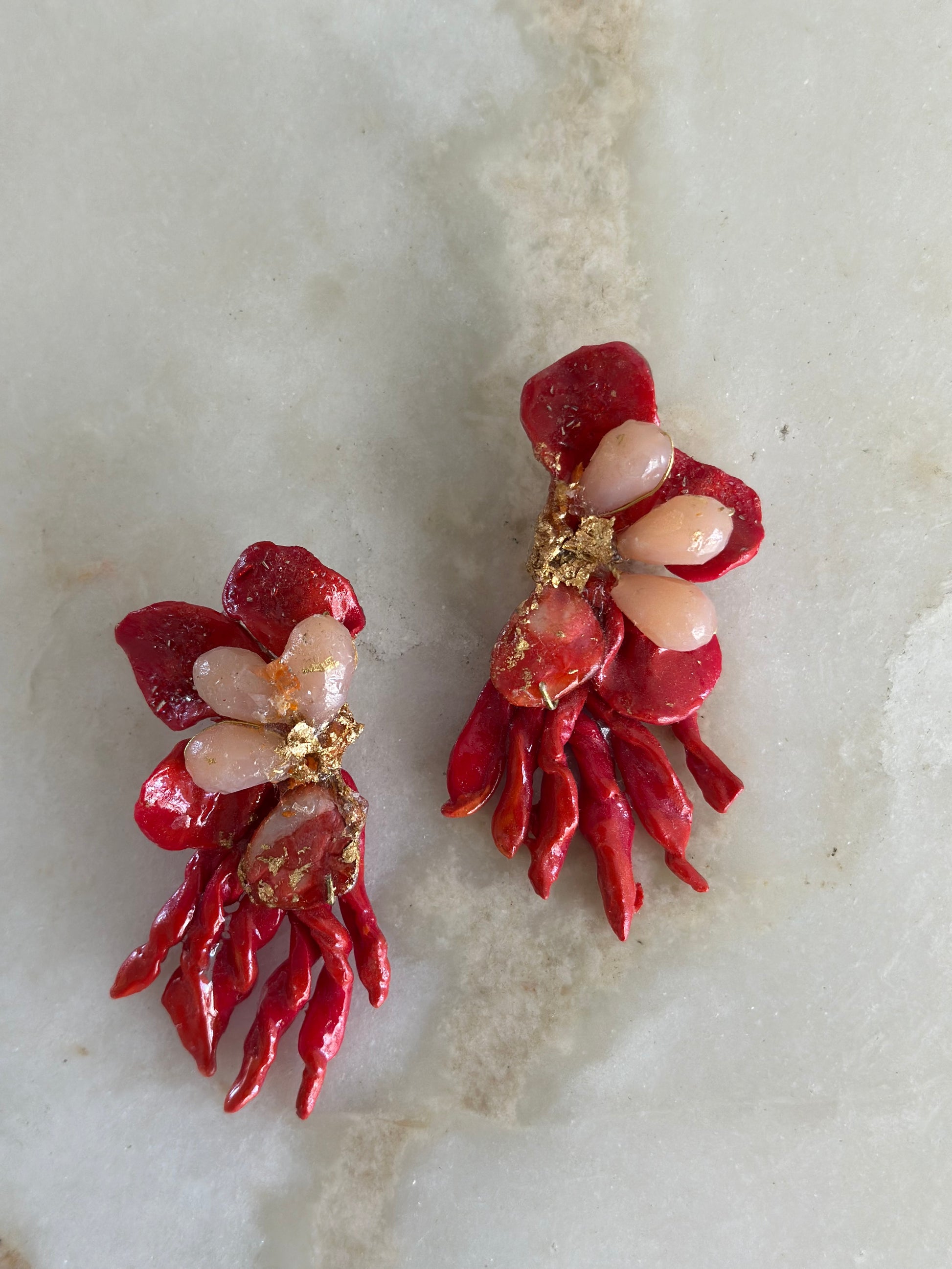 Una pase en rojo con tintes naranjas, piedras rosa y todo el touch dorado que necesita.