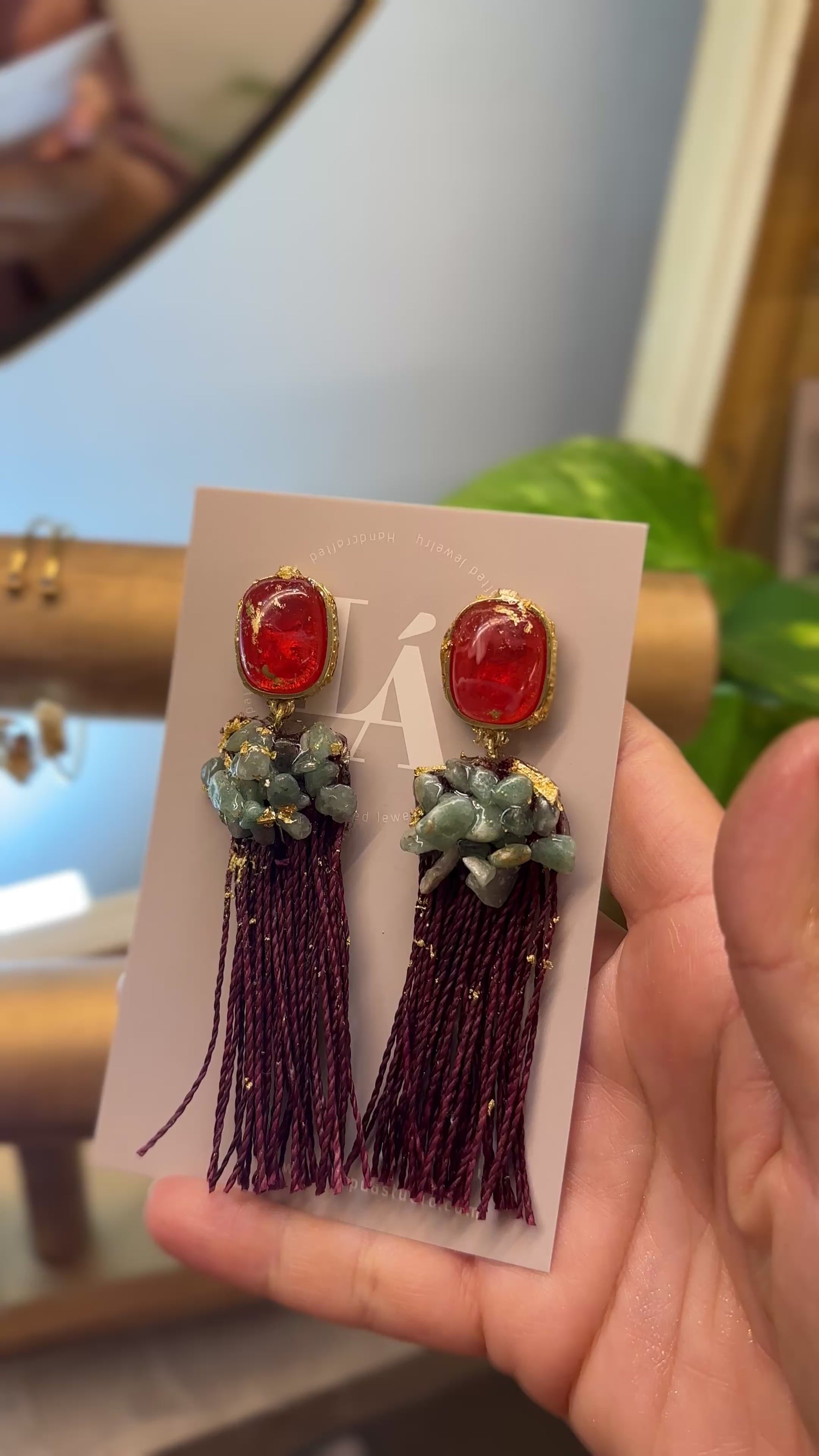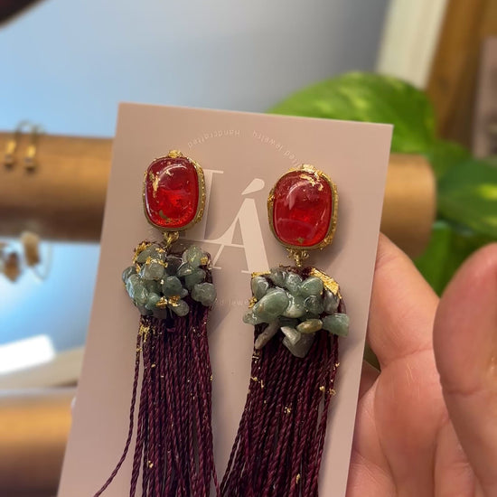 Prendedor en acero con engarce de piedra en acrílico rojo más colgante de hilos con detalles en piedras de cuarzo verde