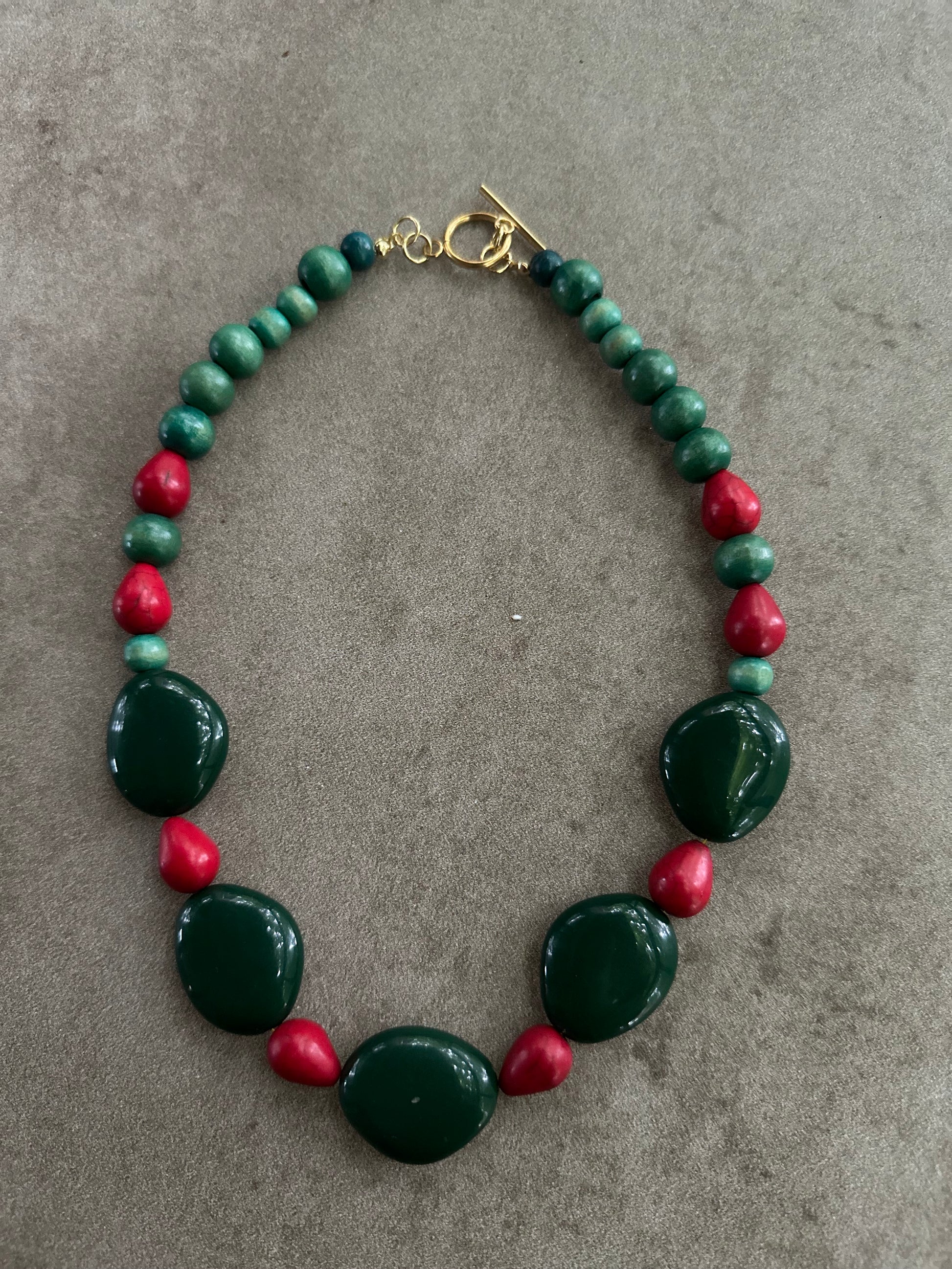 Cuentas de madera, de acrílicos y piedras naturales e verdes y rojos vibrantes.